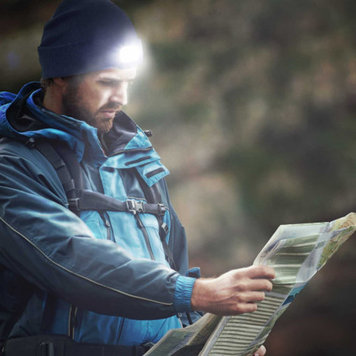 Radical knitted acrylic beanie with twin layer construction for extra warmth, a roll up cuff and a unique built in head lamp. The lamp has three light settings and uses futuristic COB (Chips on Board) technology which increases both the light intensity and the battery life. The light module is easily removed from the beanie and plugs into any USB port or a mains adaptor for recharging. It is supplied with an instruction leaflet.